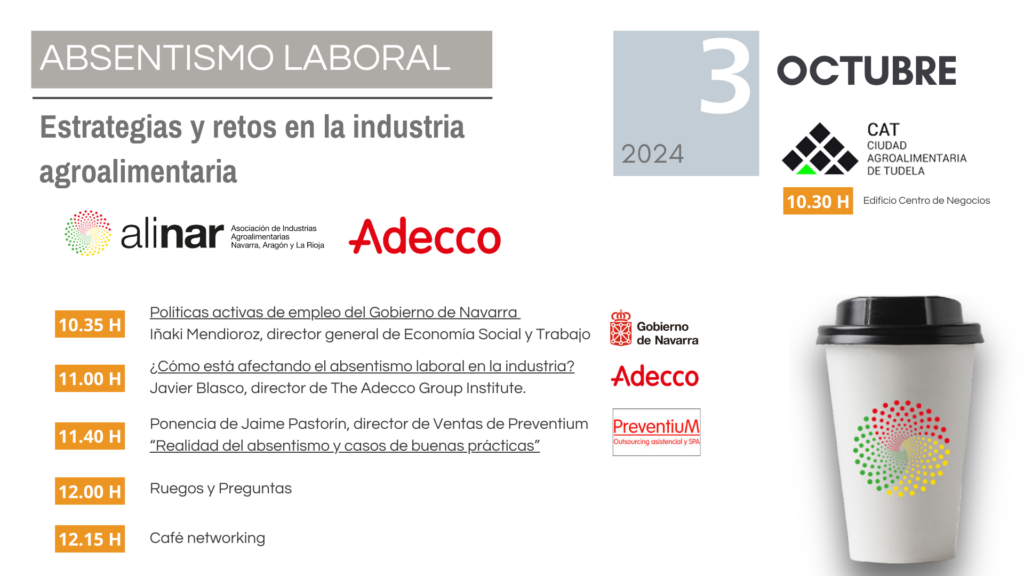 La jornada organizada de la mano de The Adecco Group Institute bajo el título «Absentismo Laboral: Estrategias y retos en la Industria Agroalimentaria» se ha desarrollado en la Ciudad Agroalimentaria de Tudela, CAT, y ha contado con la participación de 40 directivos y responsables de RRHH de empresas agroalimentarias socias. El evento se ha organizado con el objetivo de desgranar la situación actual y analizar en profundidad esta problemática con el objetivo de que nuestras empresas puedan abordarla mejor y conocer un poco más sobre algunas de sus causas y posibles estrategias de actuación.